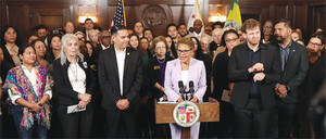 트럼프 행정부의 강경 이민 단속이 시민권자를 상대로도 무차별적이고 폭력적으로 이뤄졌다는 탐사 보도가 나오면서 논란이 되고 있다. 이민자들을 타겟으로 한 무차별적 단속으로 합법 이민자들의 불안감도 높아지고 있는 가운데 이민 당국의 공권력 남용에 대한 연방의회 차원의 조사가 이뤄질 예정이어서 주목되고 있다. 20일 LA 시청에서는 캐런 배스 LA시장(사진, 앞줄 가운데)과 시의원들이 나서서 연방 이민 단속 요원들이 법원의 영장이나 합리적 근거 없이 국 시민권자와 합법 이민자들을 불법적으로 체포 및 구금하고 폭력을 행사한 사건에 대한 연