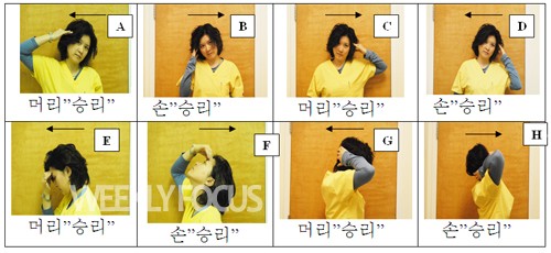 1.머리를 손쪽으로 밀면서 머리가 갈수있는 운동범위만큼가자. 여기서는 머리가 미는 힘이 손의 힘보다 이기게 하자.(그림 A.C.E.G)