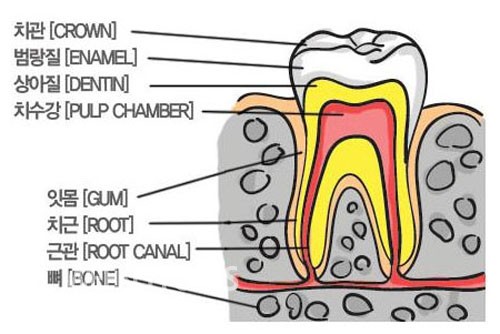 약 60년 전에는 미국인 아동에 충치가 많았는데 지금 아동들의 충치는 많이 없어졌고, 오히려 인디언 등 소수민족들에게 더 많다. 치과 위생이 많이 발달됐기 때문이다. 치아는 인체에서 제일 강도가 강한 에나멜(Enamel)이란 것으로 덮여 있다. 약 200 Pounds per square inch 힘으로 씹으며 평생 쓰려니 강할 수 밖에 없다. 에나멜은 97%가 무기물로 수정과 같이 깨질 수도 있다. 깨짐 방지를 위해 속에 에나멜보다 두꺼운 덴틴(Dentin)이라는 지지구조가 받쳐주고 있다. 무기물이 70%, 유기물이 30%다. 속에는 다시 공간이 있어 치수(신경, 피, 다른 조직이 들어있는데 닿으면 아프므로 보통 신경으로 알려져 있다)가 있어 덴틴에 영양을 공급해 준다.