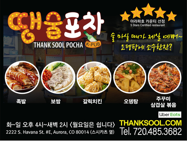 콜로라도에서 한국의 정취를 느낄 수 있는 땡술포차는 항상 스페셜한 메뉴를 준비하고 있다. 돈까스, 아구찜, 매운 등갈비찜을 비롯해 시즌마다 나오는 신선한 과일 등의 특별 메뉴를 준비해서 항상 새로운 맛으로 고객에게 다가간다.