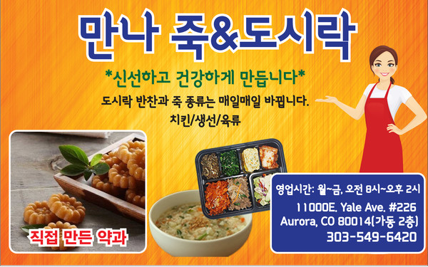 매일 신선하고 건강하게 만드는 죽과 도시락을 즐길 수 있는 <만나 죽 & 도시락>은 다양한 육류와 생선, 맛깔나는 나물반찬과 한국식 밑반찬 등으로 매일 다른 도시락 반찬으로 고객들의 입맛을 매혹시킨다.