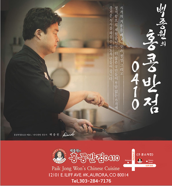 <홍콩반점 0410>은 한국의 요식업계의 대부라고 불리우는 백종원씨가 심혈을 기울여 만든 소스를 사용하기 때문에 맛이 보장될 뿐만 아니라. 가격 면에서도 저렴해, 실패 없는 프랜차이즈점으로 잘 알려져 있다. 가장 인기 있는 메뉴는 불향 가득한 짬뽕, 짜장면과 쟁반짜장, 쫄깃한 탕수육, 바삭한 군만두가 대표적이다. 역시 짬뽕 전문점답게 일반 짬뽕(짬뽕밥), 비프 짬뽕(짬뽕밥), 고추짬뽕(짬뽕밥) 등 짬뽕의 맛에 차별화를 두었다. 홍콩반점 0410 오로라점 주소는 12101 E. Iliff Ave., #K, Aurora, CO 80014(구 본스치킨)이며, 오픈 시간은 오전 11시부터 오후 8시 30분까지, 주 7일 오픈한다. 전화번호는 303-284-7176이다.