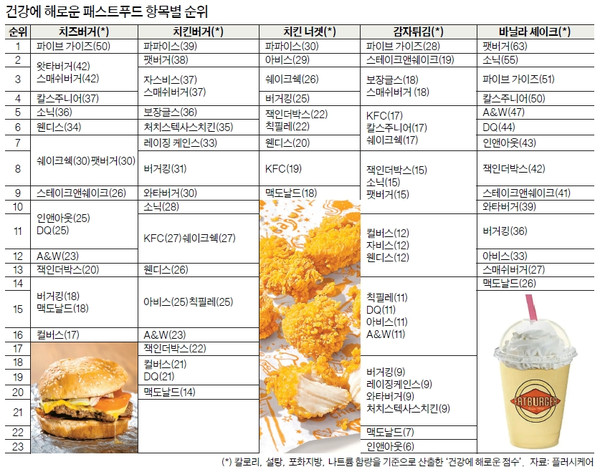 24개 유명 체인점 메뉴 건강유해점수 산출 치즈버거 파이브 가이즈 포화지방 최고