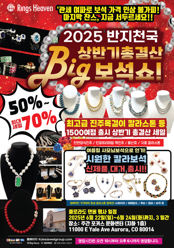 고베쥬얼그룹의 대표 브랜드 반지천국이 2025년 상반기를 마무리하며, 콜로라도 덴버에서 특별 보석 쇼를 개최한다. 이번 행사는 6월 22일(일)부터 6월 24일(화)까지 단 3일간, 오로라에 위치한 주간 포커스 문화센터(지하 1층)에서 열린다. 이번 쇼에서는 총 1,500여 점에 달하는 고급 진주 및 칼라스톤 신제품이 대거 선보이며, 최근 예고된 관세 인상으로 인해 보석 가격이 전반적으로 오르기 전, 마지막으로 합리적인 가격에 구매할 수 있는 절호의 기회가 될 것으로 기대된다. 진주 목걸이, 브로치, 반지, 팬던트 등 다양한 품목들이 최대 70%~50% 할인된 가격에 제공되며, 특히 ‘사모님 보석’으로 불리는 청량한 색감의 칼라보석 제품들이 여름 시즌 큰 인기를 끌고 있다. 블루, 민트, 레몬 컬러 등 시원하고 산뜻한 색상의 원석을 활용한 다채로운 디자인이 중년 여성 고객들의 마음을 사로잡고 있다.