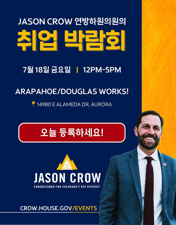 제이슨 크로우 연방하원의원이 주관하는 취업박람회가 오는 7월18일 금요일 오후 12시부터 오후 5시까지 Arapahoe County Department of Human Services 에서 열린다.주소는 14980 E. Alameda Dr. Aurora 이다. 참가를 원하면 Crow.House.Gov/Events 에서 등록하면 된다.